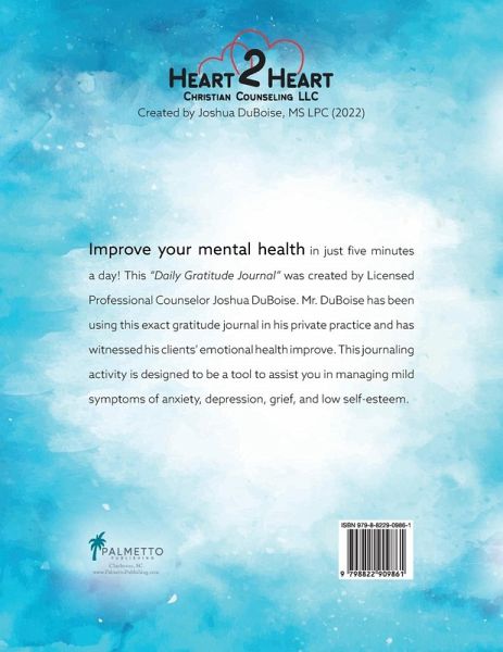 Improve your mental health in just five minutes a day! This "Daily Gratitude Journal" was created by Licensed Professional Counselor Joshua DuBoise. Mr. DuBoise has been using this exact gratitude journal in his private practiceand has witnessed his clients' emotional health improve. This journaling activity is designed to be a tool to assist you in managing mild symptoms of anxiety, depression, grief, and low self-esteem..