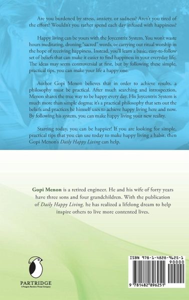 Do you think that unhappiness is the unavoidable lot of human beings? Does happiness seem an unreachable goal for you? Not so says author Gopi Menon in his book 'Daily Happy Living'! He declares that you can be happy every day of your life by using the Joycentrix System described in this book. The Joycentrix System is a new philosophy that makes it easier to find happiness in this world. It outlines a simple natural way to make Happy Living a habit. You do not have to spend hours meditating, or carry out ritual worship in the hope of receiving happiness. Instead, you'll learn a basic, easy-to-follow set of beliefs that make it easier to find happiness in your everyday life. The ideas may seem controversial at first, but by following these simple, practical tips, you can make your life a happy one. Author Gopi Menon believes that in order to achieve results, a philosophy must be practical. His Joycentrix System is much more than simple dogma; it's a practical philosophy that sets out the beliefs and practices he himself uses to achieve happy living here and now. By following his system, you can make happy living your new reality. Some of the benefits you get from reading this book are: * You learn why it is pointless to 'pursue happiness' as explained in Chapter 6. * How you too can overcome road rage (or uncontrollable anger) almost overnight as shown in Chapter 12. * You learn the difference between Pseudo-Happiness and Real Happiness or Joy in the Chapter entitled Misconceptions About Happiness. * Learn about 'daily miracles' and gratitude in Chapter 8. * How a marriage headed for the rocks was saved by applying Happy Living Tips 4 & 5. * How to feel upbeat and energized using Happy Living Tips 8, 9 & 10. * And much much more Starting today, you can be happier! If you are looking for simple, practical tips that you can use today to make happy living a habit, then Gopi Menon's Daily Happy Living can help.