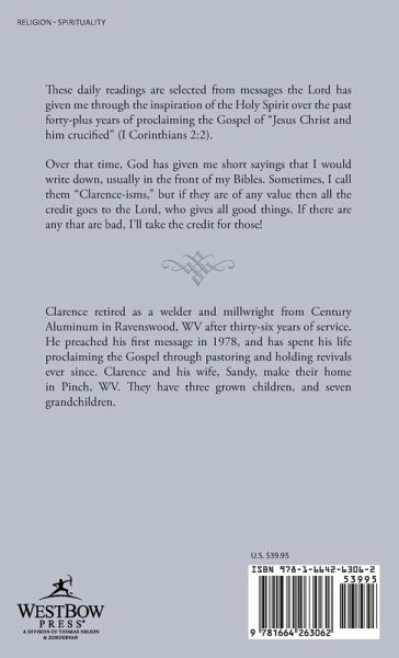 These daily readings are selected from messages the Lord has given me through the inspiration of the Holy Spirit over the past forty-plus years of proclaiming the Gospel of "Jesus Christ and him crucified" (I Corinthians 2:2). Over that time, God has given me short sayings that I would write down, usually in the front of my Bibles. Sometimes, I call them "Clarence-isms," but if they are of any value then all the credit goes to the Lord, who gives all good things. If there are any that are bad, I'll take the credit for those!