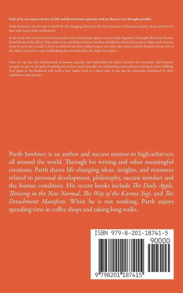 Each of us can create a better sex life and discover more pleasure and joy than we ever thought possible. Daily Intimacy is an attempt to distill the life-changing ideas from the best resources on human sexuality, desire, and love in clear and concise daily meditations. In this book, the wisdom of renowned authors and relationship experts such as Emily Nagoski, Christopher Ryan, Ian Kerner, David Deida, Esther Perel, Osho, John Gray, and Robert Greene has been distilled in a form that is easy to digest and consume (even if you're not a reader!). Every meditation has been crafted to give you…mehr