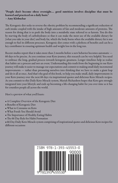 "People don't become obese overnight.... good nutrition involves discipline that must be learned and practiced on a daily basis." -- Amy Klobuchar The Ketogenic diet seeks to reverse the obesity problem by recommending a significant reduction of carb intake coupled with the intake of high amounts of fats and moderate amounts of proteins. The reason for doing that is to push the body into a metabolic state referred to as ketosis. You do this by starving the body of carbohydrates so that it can make the most use of the available dietary fat (what you take in your diet) and body fat, which the body burns when the available dietary fat is not enough to fuel its different processes. Ketogenic diet comes with a plethora of benefits and can be a key contributor in ensuring optimum health and weight loss in the long run. Recent studies report that it takes more than 2 months before a new behavior becomes automatic - 66 days to be precise. As you continue your Keto journey, this research can be very helpful. You need to embrace the long, gradual process towards ketogenic greatness. Longer timelines help us realize that habits are a process and not an event. Understanding this truth from the beginning in our Keto journey will make it easier to manage our expectations and commit to making small daily incremental improvements - rather than pressuring ourselves into thinking that we have to make a giant leap and do it all at once. And that's the goal of this book, to help you make small, daily improvements in your Keto journey over the next 66 days via inspirational quotes and delicious Keto Miracle recipes. As you commit to this Daily Keto Miracle system, Mariah Richardson hopes that Keto gets strongly integrated into your lifestyle and ends up becoming a life-changing habit for you over time as it has for countless people all across the world. Here's a preview of what you'll learn: • A Complete Overview of the Ketogenic Diet • Benefits of Ketogenic Diet • What to Consume on Keto • What Foods You Should Avoid • The Importance of Healthy Eating Habits • The 66 Day Rule for Habit Formation • 66 Day Daily Keto Miracle system comprising of inspirational quotes and delicious Keto recipes for different occasions