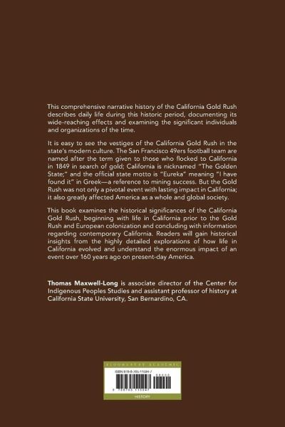 This comprehensive narrative history of the California Gold Rush describes daily life during this historic period, documenting its wide-reaching effects and examining the significant individuals and organizations of the time. It is easy to see the vestiges of the California Gold Rush in the state's modern culture. The San Francisco 49ers football team are named after the term given to those who flocked to California in 1849 in search of gold; California is nicknamed "The Golden State;" and the official state motto is "Eureka" meaning "I have found it" in Greek-a reference to mining success. But the Gold Rush was not only a pivotal event with lasting impact in California; it also greatly affected America as a whole and global society. This book examines the historical significances of the California Gold Rush, beginning with life in California prior to the Gold Rush and European colonization and concluding with information regarding contemporary California. Readers will gain historical insights from the highly detailed explorations of how life in California evolved and understand the enormous impact of an event over 160 years ago on present-day America.