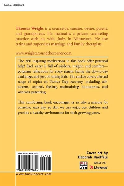 The 366 inspiring meditations in this book offer practical help! Each entry is full of wisdom, insight, and comfort-poignant reflections for every parent facing the day-to-day challenges and joys of raising kids. The author covers a broad range of topics on Twelve Step recovery, including self-esteem, control, feeling, maintaining boundaries, and win/win parenting. This comforting book encourages us to take a minute for ourselves each day, so that we can enjoy our children and provide a healthy environment for their growing years.