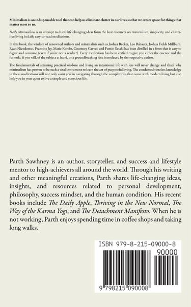 Minimalism is an indispensable tool that can help us eliminate clutter in our lives so that we create space for things that matter most to us. Daily Minimalism is an attempt to distill life-changing ideas from the best resources on minimalism, simplicity, and clutter-free living in daily easy-to-read meditations. In this book, the wisdom of renowned authors and minimalists such as Joshua Becker, Leo Babauta, Joshua Fields Millburn, Ryan Nicodemus, Francine Jay, Marie Kondo, Courtney Carver, and Fumio Sasaki has been distilled in a form that is easy to digest and consume (even if you're not a reader!). Every meditation has been crafted to give you either the essence and the formula, if you will, of the subject at hand, or a groundbreaking idea introduced by the respective author. The fundamentals of attaining practical wisdom and living an intentional life with less will never change and that's why minimalism has proven to be such a vital instrument to learn the art of purposeful living. The condensed timeless knowledge in these meditations will not only assist you in navigating through the complexities that come with modern living but also help you in your quest to live a simple and conscious life.