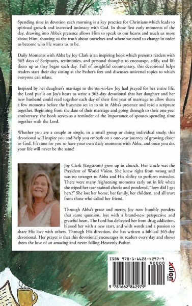 Spending time in devotion each morning is a key practice for Christians which leads to spiritual growth and increased intimacy with God. In those first early moments of the day, drawing into Abba's presence allows Him to speak to our hearts and teach us more about Him, showing us the truth about ourselves and where we need to change in order to become who He wants us to be. Daily Moments with Abba by Joy Clark is an inspiring book which presents readers with 365 days of Scriptures, testimonies, and personal thoughts to encourage, edify, and lift them up as they begin each day. Full of insightful commentary, this devotional helps readers start their day sitting at the Father's feet and discusses universal topics to which everyone can relate. Inspired by her daughter's marriage to the son-in-law Joy had prayed for her entire life, the Lord put it on Joy's heart to write a 365-day devotional that her daughter and her new husband could read together each day of their first year of marriage to allow them a few moments before the busyness set in to sit in Abba's presence and read a scripture together. Beginning from the date of their marriage and going through to their one-year anniversary, the book serves as a reminder of the importance of spouses spending time together with the Lord. Whether you are a couple or single, in a small group or doing individual study, this devotional will inspire you and help you embark on a one-year journey of growing closer to God. It's time for you to have your own daily moments with Abba, and once you do, your life will never be the same!