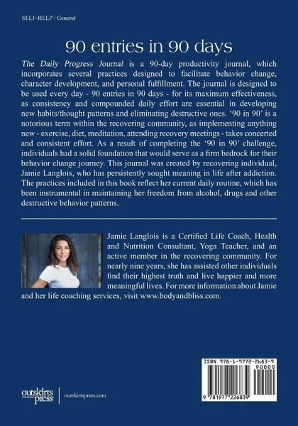 The Daily Progress Journal is a 90-day productivity journal, which incorporates several practices designed to facilitate behavior change, character development, and personal fulfillment. The journal is designed to be used every day - 90 entries in 90 days - for its maximum effectiveness, as consistency and compounded daily effort are essential in developing new habits/thought patterns and eliminating destructive ones. '90 in 90' is a notorious term within the recovering community, as implementing anything new - exercise, diet, meditation, attending recovery meetings - takes concerted and consistent effort. As a result of completing the '90 in 90' challenge, individuals had a solid foundation that would serve as a firm bedrock for their behavior change journey. This journal was created by recovering individual, Jamie Langlois, who has persistently sought meaning in life after addiction. The practices included in this book reflect her current daily routine, which has been instrumental in maintaining her freedom from alcohol, drugs and other destructive behavior patterns.