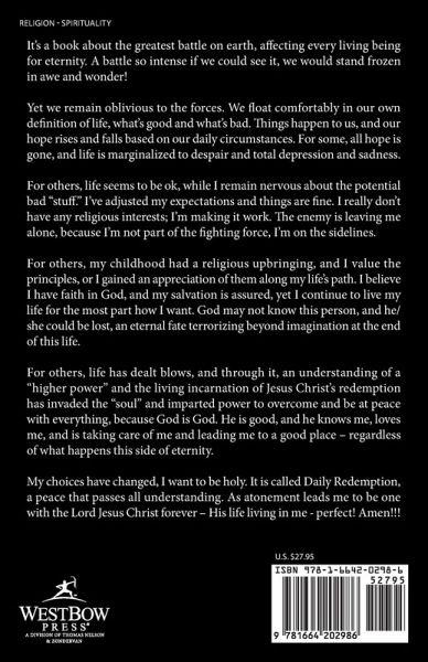 It's a book about the greatest battle on earth, affecting every living being for eternity. A battle so intense if we could see it, we would stand frozen in awe and wonder! Yet we remain oblivious to the forces. We float comfortably in our own definition of life, what's good and what's bad. Things happen to us, and our hope rises and falls based on our daily circumstances. For some, all hope is gone, and life is marginalized to despair and total depression and sadness. For others, life seems to be ok, while I remain nervous about the potential bad "stuff." I've adjusted my expectations and things are fine. I really don't have any religious interests; I'm making it work. The enemy is leaving me alone, because I'm not part of the fighting force, I'm on the sidelines. For others, my childhood had a religious upbringing, and I value the principles, or I gained an appreciation of them along my life's path. I believe I have faith in God, and my salvation is assured, yet I continue to live my life for the most part how I want. God may not know this person, and he/she could be lost, an eternal fate terrorizing beyond imagination at the end of this life. For others, life has dealt blows, and through it, an understanding of a "higher power" and the living incarnation of Jesus Christ's redemption has invaded the "soul" and imparted power to overcome and be at peace with everything, because God is God. He is good, and he knows me, loves me, and is taking care of me and leading me to a good place - regardless of what happens this side of eternity. My choices have changed, I want to be holy. It is called Daily Redemption, a peace that passes all understanding. As atonement leads me to be one with the Lord Jesus Christ forever - His life living in me - perfect! Amen!!!