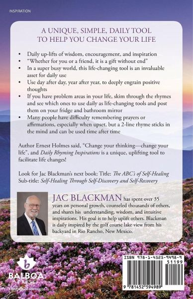 "A UNIQUE, SIMPLE, DAILY TOOL TO HELP YOU CHANGE YOUR LIFE ¿ Daily up-lifts of wisdom, encouragement, and inspiration¿ "Whether for you or a friend, it is a gift without end"¿ In a super busy world, this life-changing tool is an invaluable asset for daily use¿ Use day after day, year after year, to deeply engrain positive thoughts ¿ If you have problem areas in your life, skim through the rhymes and see which ones to use daily as life-changing tools and post them on your fridge and bathroom mirror¿ Many people have difficulty remembering prayers or affirmations, especially when upset, but a 2-line rhyme sticks in the mind and can be used time after time Author Ernest Holmes said, "Change your thinking-change your life", and Daily Rhyming Inspirations is a unique, uplifting tool to facilitate life changes! Look for Jac Blackman's next book: Title: The ABC's of Self-HealingSub-title: Self-Healing Through Self-Discovery and Self-Recovery"