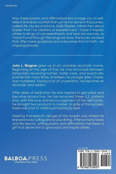 John L. Wagner grew up in an unstable alcoholic home. Beginning at the age of five, he was bounced between temporary receiving homes, foster care, and eventually juvenile hall, many times. At sixteen, his younger sister, Cherie, was murdered. Facing a lot of uncertainty, he became an alcoholic and addict. After years of addiction, he was inspired to get sober and become productive. He has received three U.S. patents and, with the love and encouragement of the Self family, he brought two products to market. In spite of this success, there was a lot of childhood trauma to heal. Seeking therapeutic refuge at the ocean was where he enjoyed body surfing and scuba diving. After so many losses and life lessons, writing poetry and affirmations has been a gift that allows him to give back and inspire to others.