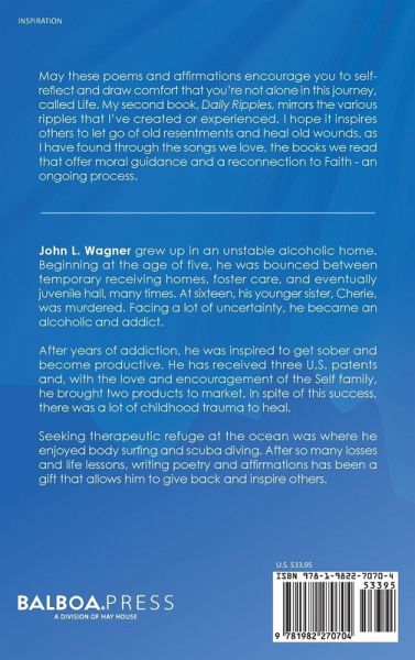 May these poems and affirmations encourage you to self-reflect and draw comfort that you're not alone in this journey, called Life. My second book, Daily Ripples, mirrors the various ripples that I've created or experienced. I hope it inspires others to let go of old resentments and heal old wounds, as I have found through the songs we love, the books we read that offer moral guidance and a reconnection to Faith - an ongoing process.
