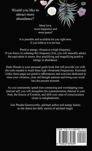 Would you like to attract more abundance? More love, more happiness and more peace? It is possible and available to you right now, if you believe it to be true. Positive energy in our lives vibrate at a high frequency. By radiating this frequency first, you will magnetically attract the same positive energy in return, thus amplifying and intensifying these loving vibrations in abundance. And this can be easily achieved by controlling your thoughts in the repetition of uplifting affirmations. Every morning upon rising, open your Daily Rituals book at random, or choose a word from the contents that you are drawn to. Read the positive affirmation and allow yourself time to be transparent with the truth. Follow through with the exercises beneath. Practice these rituals regularly to raise your vibration and your mind will be trained to think positive thoughts from the moment you wake up to the second you fall asleep, promoting and attracting an affluence of positive energy, health, happiness, love and peace.¿¿Transform your life to create beauty and peace in the world around you. We can create positive vibrations by practicing affirmations of self-love and gratitude. Through the daily repetition of these rituals we clear old thought patterns, focus our time into the now, hence creating new pathways to form a peaceful and happy life. By spending time connecting and worshipping our internal self, we are creating an open communication channel to our Soul, the Source of Creation, and shifting our state of consciousness closer to enlightenment. Through acknowledgment and gratitude for life's blessings, we create positive thought vibrations. If we repeat these uplifting affirmations daily, our mind will consistently reach higher frequencies of optimized vibrations. Join Phoebe Garnsworthy, Visionary and Metaphysical writer, as she shares her daily secrets to attracting and magnifying an abundance of positive energy, health, happiness, love and peace.