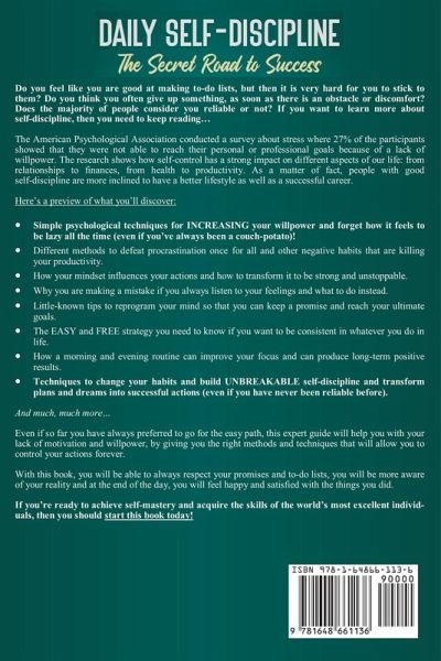 Do you feel like you are good at making to-do lists, but then it is very hard for you to stick to them? Do you think you often give up something, as soon as there is an obstacle or discomfort? Does the majority of people consider you reliable or not? If you want to learn more about self-discipline, then you need to keep reading... The American Psychological Association conducted a survey about stress where 27% of the participants showed that they were not able to reach their personal or professional goals because of a lack of willpower. The research shows how self-control has a strong impact on different aspects of our life: from relationships to finances, from health to productivity. As a matter of fact, people with good self-discipline are more inclined to have a better lifestyle as well as a successful career. Here's a preview of what you'll discover:Simple psychological techniques for INCREASING your willpower and forget how it feels to be lazy all the time (even if you've always been a couch-potato)! Different methods to defeat procrastination once for all and other negative habits that are killing your productivity. How your mindset influences your actions and how to transform it to be strong and unstoppable. Why you are making a mistake if you always listen to your feelings and what to do instead. Little-known tips to reprogram your mind so that you can keep a promise and reach your ultimate goals. The EASY and FREE strategy you need to know if you want to be consistent in whatever you do in life. How a morning and evening routine can improve your focus and can produce long-term positive results. Techniques to change your habits and build UNBREAKABLE self-discipline and transform plans and dreams into successful actions (even if you have never been reliable before). And much, much more... Even if so far you have always preferred to go for the easy path, this expert guide will help you with your lack of motivation and willpower, by giving you the right methods and techniques that will allow you to control your actions forever. With this book, you will be able to always respect your promises and to-do lists, you will be more aware of your reality and at the end of the day, you will feel happy and satisfied with the things you did. If you're ready to achieve self-mastery and acquire the skills of the world's most excellent individuals, then you should start this book today!