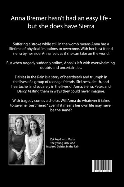 Anna Bremer hasn't had an easy life - but she does have Sierra. Suffering a stroke while still in the womb means Anna has a lifetime of physical limitations to overcome. With her best friend Sierra by her side, Anna feels as if she can take on the world. But when tragedy strikes, Anna is left with overwhelming doubts and uncertainties. Daisies in the Rain is a story of heartbreak and triumph in the lives of a group of teenage friends. Sickness, death, and heartache land squarely in the lives of Anna, Sierra, Peter, and Darcy, testing them in ways they could never imagine. With tragedy comes a choice. Will Anna do whatever it takes to save her best friend? Even if it means her own life may never be the same?