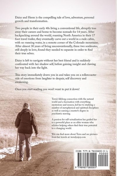 Daisy and Herm is a compelling tale of love, adventure, personal growth, and transformation. Two people in their early 40s living a conventional life, abruptly toss away their careers and home to become nomads for 14 years. After backpacking around the world, roaming North America in their 17-foot travel trailer, they eventually carve out a world in a rude cabin, with no running water, in a remote corner of the Colorado mountains. After almost 30 years of living unconventionally, these two soulmates, still deeply in love, found they needed to separate in order to find their true selves. Daisy is left to navigate without her best friend and is suddenly confronted with her shadow self, before gaining insight and clawing her way back into the light. This story immediately draws you in and takes you on a rollercoaster ride of emotions from laughter to despair, self-discovery, and awakening. Once you start reading you won't want to put it down!