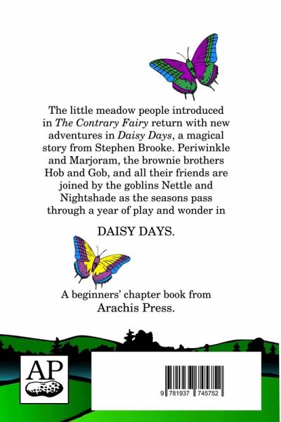 The little meadow people introduced in 'The Contrary Fairy' return with new adventures in 'Daisy Days,' a magical story from Stephen Brooke. Periwinkle and Marjoram, the brownie brothers Hob and Gob, and all their friends are joined by the goblins Nettle and Nightshade as the seasons pass through a year of play and wonder in DAISY DAYS. A beginners' chapter book from Arachis Press.