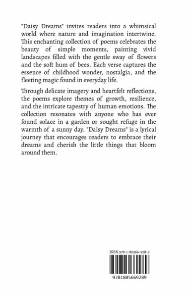 "Daisy Dreams" invites readers into a whimsical world where nature and imagination intertwine. This enchanting collection of poems celebrates the beauty of simple moments, painting vivid landscapes filled with the gentle sway of flowers and the soft hum of bees. Each verse captures the essence of childhood wonder, nostalgia, and the fleeting magic found in everyday life. Through delicate imagery and heartfelt reflections, the poems explore themes of growth, resilience, and the intricate tapestry of human emotions. The collection resonates with anyone who has ever found solace in a garden or sought refuge in the warmth of a sunny day. "Daisy Dreams" is a lyrical journey that encourages readers to embrace their dreams and cherish the little things that bloom around them.
