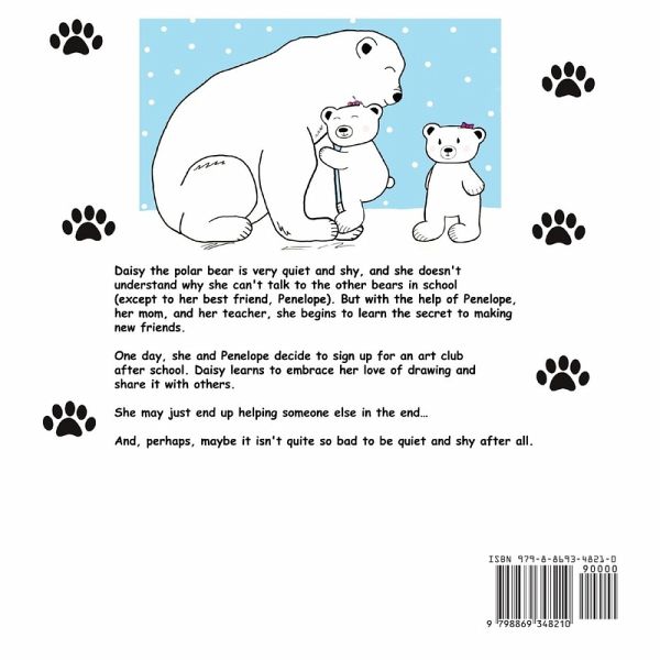 Daisy the polar bear is very quiet and shy, and she doesn't understand why she can't talk to the other bears in school (except to her best friend, Penelope). But with the help of Penelope, her mom, and her teacher, she begins to learn the secret to making new friends. One day, she and Penelope decide to sign up for an art club after school. Daisy learns to embrace her love of drawing and share it with others. She may just end up helping someone else in the end... And, perhaps, maybe it isn't quite so bad to be quiet and shy after all.