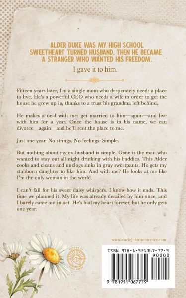 Alder Duke was my high school sweetheart turned husband, then he became a stranger who wanted his freedom. I gave it to him. Fifteen years later, I'm a single mom who desperately needs a place to live. He's a powerful CEO who needs a wife in order to get the house he grew up in, thanks to a trust his grandma left behind. He makes a deal with me: get married to him-again-and live with him for a year. Once the house is in his name, we can divorce-again-and he'll rent the place to me. Just one year. No strings. No feelings. Simple. But nothing about my ex-husband is simple. Gone is the man who wanted to stay out all night drinking with his buddies. This Alder cooks and cleans and unclogs sinks in gray sweatpants. He gets my stubborn daughter to like him. And with me? He looks at me like I'm the only woman in the world. I can't fall for his sweet daisy whispers. I know how it ends. This time we planned it. My life was already derailed by him once, and I barely came out intact. He's had my heart forever, but he only gets one year.