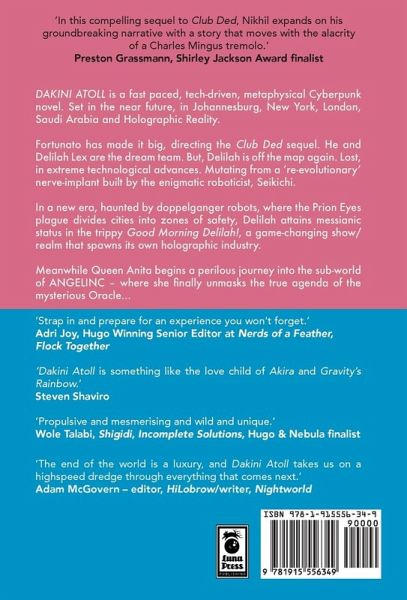"Dakini Atoll is a fast paced, tech-driven, metaphysical Cyberpunk novel. Set in the near future, in Johannesburg, New York, London, Saudi Arabia and Holographic Reality. Fortunato has made it big, directing the Club Ded sequel. He and Delilah Lex are the dream team. But, Delilah is off the map again. Lost, in extreme technological advances. Mutating from a 're-evolutionary' nerve-implant built by the enigmatic roboticist, Seikichi. In a new era, haunted by doppelganger robots, where the Prion Eyes plague divides cities into zones of safety, Delilah attains messianic status in the trippy Good Morning Delilah!, a game-changing show/realm that spawns its own holographic industry. Meanwhile Queen Anita begins a perilous journey into the sub-world of ANGELINC - where she finally unmasks the true agenda of the mysterious Oracle..."--