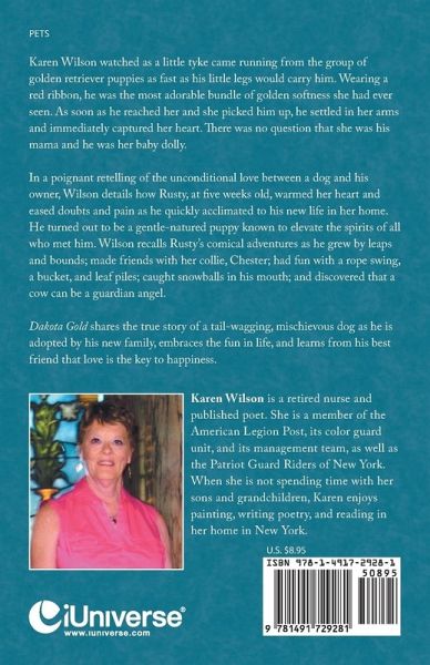 Karen Wilson watched as a little tyke came running from the group of golden retriever puppies as fast as his little legs would carry him. Wearing a red ribbon, he was the most adorable bundle of golden softness she had ever seen. As soon as he reached her and she picked him up, he settled in her arms and immediately captured her heart. There was no question that she was his mama and he was her baby dolly. In a poignant retelling of the unconditional love between a dog and his owner, Wilson details how Rusty, at five weeks old, warmed her heart and eased doubts and pain as he quickly acclimated to his new life in her home. He turned out to be a gentle-natured puppy known to elevate the spirits of all who met him. Wilson recalls Rusty?s comical adventures as he grew by leaps and bounds; made friends with her collie, Chester; had fun with a rope swing, a bucket, and leaf piles; caught snowballs in his mouth; and discovered that a cow can be a guardian angel. Dakota Gold shares the true story of a tail-wagging, mischievous dog as he is adopted by his new family, embraces the fun in life, and learns from his best friend that love is the key to happiness.