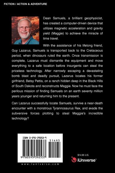 Dean Samuels, a brilliant geophysicist, has created a computer-driven device that utilizes magnetic acceleration and gravity yield (Maggie) to achieve the miracle of time travel. With the assistance of his lifelong friend, Guy Lazarus, Samuels is transported back to the Cretaceous period, when dinosaurs ruled the earth. Once transmission is complete, Lazarus must dismantle the equipment and move everything to a safe location before insurgents can steal the priceless technology. After narrowly escaping a devastating bomb blast and deadly pursuit, Lazarus locates his former girlfriend, Betsy Pettis, on a ranch hidden deep in the Black Hills of South Dakota and reconstructs Maggie. Now he must face the perilous mission of finding Samuels on an earth seventy million years younger and returning him to the present. Can Lazarus successfully locate Samuels, survive a near-death encounter with a monstrous Tyrannosaurus Rex, and evade the subversive forces plotting to steal Maggie's incredible technology?