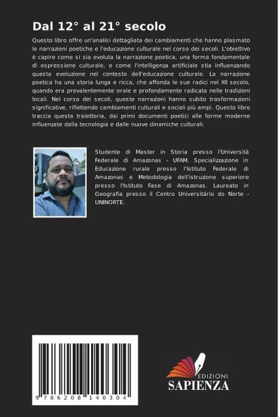 Questo libro offre un'analisi dettagliata dei cambiamenti che hanno plasmato le narrazioni poetiche e l'educazione culturale nel corso dei secoli. L'obiettivo è capire come si sia evoluta la narrazione poetica, una forma fondamentale di espressione culturale, e come l'intelligenza artificiale stia influenzando questa evoluzione nel contesto dell'educazione culturale. La narrazione poetica ha una storia lunga e ricca, che affonda le sue radici nel XII secolo, quando era prevalentemente orale e profondamente radicata nelle tradizioni locali. Nel corso dei secoli, queste narrazioni hanno subito trasformazioni significative, riflettendo cambiamenti culturali e sociali più ampi. Questo libro traccia questa traiettoria, dai primi documenti poetici alle forme moderne influenzate dalla tecnologia e dalle nuove dinamiche culturali.