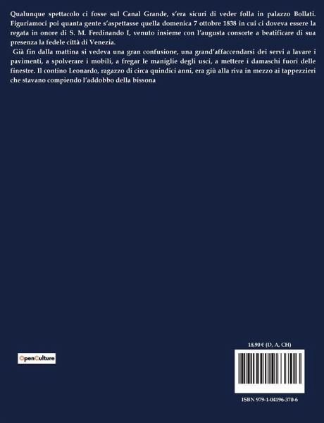 Qualunque spettacolo ci fosse sul Canal Grande, s¿era sicuri di veder folla in palazzo Bollati. Figuriamoci poi quanta gente s¿aspettasse quella domenica 7 ottobre 1838 in cui ci doveva essere la regata in onore di S. M. Ferdinando I, venuto insieme con l¿augusta consorte a beatificare di sua presenza la fedele città di Venezia. Già fin dalla mattina si vedeva una gran confusione, una grand¿affaccendarsi dei servi a lavare i pavimenti, a spolverare i mobili, a fregar le maniglie degli usci, a mettere i damaschi fuori delle finestre. Il contino Leonardo, ragazzo di circa quindici anni, era giù alla riva in mezzo ai tappezzieri che stavano compiendo l¿addobbo della bissona
