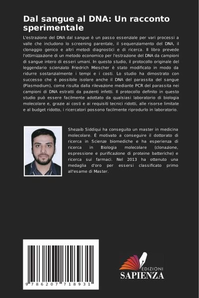 L'estrazione del DNA dal sangue è un passo essenziale per vari processi a valle che includono lo screening parentale, il sequenziamento del DNA, il clonaggio genico e altri metodi diagnostici e di ricerca. Il libro prevede l'ottimizzazione di un metodo economico per l'estrazione del DNA da campioni di sangue intero di esseri umani. In questo studio, il protocollo originale del leggendario scienziato Friedrich Miescher è stato modificato in modo da ridurre sostanzialmente i tempi e i costi. Lo studio ha dimostrato con successo che è possibile isolare anche il DNA del parassita del sangue (Plasmodium), come risulta dalla rilevazione mediante PCR del parassita nei campioni di DNA estratti da pazienti infetti. Il protocollo definito in questo studio può essere facilmente adottato da qualsiasi laboratorio di biologia molecolare e, grazie ai costi e ai requisiti tecnici ridotti, alle risorse limitate e al budget ridotto, i ricercatori possono facilmente riprodurlo in laboratorio.
