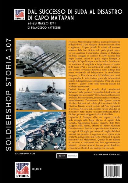Francesco Mattesini propone la sua quarta pubblicazione sull'episodio di Capo Matapan, ulteriormente arricchita e aggiornata. L'opera prende le mosse dal successo ottenuto dalla base di Suda solo pochi giorni prima, per poi analizzare il drammatico disastro di Matapan, rendendo omaggio al sacrificio di 2.308 marinai della Regia Marina, caduti in quella tragica battaglia. La battaglia di Capo Matapan si svolse in due fasi distinte: un confronto di artiglieria a lunga distanza avvenuto il 28 marzo 1941, a sud dell'isola di Gaudo (Creta), e uno scontro ravvicinato durante la notte, al largo della punta occidentale del Peloponneso. In quest'ultimo frangente, la Flotta britannica del Mediterraneo riuscì a sorprendere le unità italiane grazie alle informazioni fornite dall'organizzazione crittografica Ultra, che aveva decifrato il giorno esatto della missione italiana nel Mediterraneo orientale. Decisivi furono gli attacchi degli aerosiluranti "Albacore" della portaerei Formidable. Inizialmente, essi danneggiarono la corazzata Vittorio Veneto, riducendone la velocità. Successivamente, durante un attacco notturno, immobilizzarono l'incrociatore Pola. Questo permise alla flotta britannica di colpire gli incrociatori della 1ª Divisione Navale, accorsi in aiuto del Pola, cogliendoli di sorpresa. Nel corso dello scontro furono affondati gli incrociatori Zara e Fiume e i cacciatorpediniere Alfieri e Gioberti, prima di infliggere il colpo finale al Pola. L'episodio di Matapan ebbe un impatto cruciale sulla strategia della Regia Marina. A seguito della battaglia, Supermarina, l'organo operativo dello Stato Maggiore della Marina, ottenne da Benito Mussolini l'autorizzazione a limitare le operazioni navali italiane a un raggio di 100 miglia (poi ridotto a 85 miglia) dalle basi terrestri, per garantirsi la copertura aerea. Questa scelta prudente, però, permise alla Flotta britannica di operare liberamente nel Mediterraneo. Quando le navi italiane si trovarono a confrontarsi con forze apparentemente inferiori, i risultati ottenuti furono spesso deludenti, evidenziando i limiti di una strategia così vincolata.