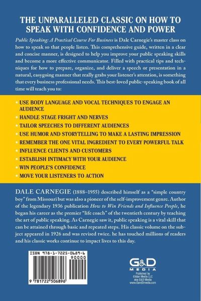 The Unparalleled Classic on how to Speak With Confidence and Power Public Speaking: A Practical Course For Business is Dale Carnegie's master class on how to speak so that people listen. This comprehensive guide, written in a clear and concise manner, is designed to help you improve your public speaking skills and become a more effective communicator. Filled with practical tips and techniques for how to prepare, organize and deliver a speech or presentation in a natural, easygoing manner that really grabs your listener's attention is something that every business professional needs. This best-loved public-speaking book of all time will teach you to: 1. Use body language and vocal techniques to engage an audience 2. Handle stage fright and nerves 3. Tailor speeches to different audiences 4. Use humor and storytelling to make a lasting impression 5. Remember the one vital ingredient to every powerful talk 6. Influence clients and customers 7. Establish intimacy with your audience 8. Win people's confidence 9. Move your listeners to action Dale Carnegie (1888-1955) described himself as a "simple country boy" from Missouri but was also a pioneer of the self-improvement genre. Author of the legendary 1936 publication of How to Win Friends and Influence People, Carnegie began his career as the premier "life coach" of the 20th century by teaching the art of public speaking. As Carnegie saw it, public speaking is a vital skill that can be attained through basic and repeated steps. His classic volume on the subject appeared in 1926 and was revised twice. he has touched millions of readers and his classic works continue to impact lives to this day.