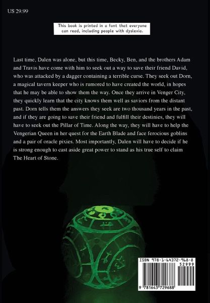 This book is Dyslexic inclusive; it is printed in a font everyone can read, including people with dyslexia. Last time, Dalen was alone, but this time, Becky, Ben, and the brothers Adam and Travis have come with him to seek out a way to save their friend David, who was attacked by a dagger containing a terrible curse. They seek out Dorn, a magical tavern keeper who is rumored to have created the world, in hopes that he may be able to show them the way. Once they arrive in Venger City, they quickly learn that the city knows them well as saviors from the distant past. Dorn tells them the answers they seek are two thousand years in the past, and if they are going to save their friend and fulfill their destinies, they will have to seek out the Pillar of Time. Along the way, they will have to help the Vengerian Queen in her quest for the Earth Blade and face ferocious goblins and a pair of oracle pixies. Most importantly, Dalen will have to decide if he is strong enough to cast aside great power to stand as his true self to claim The Heart of Stone.