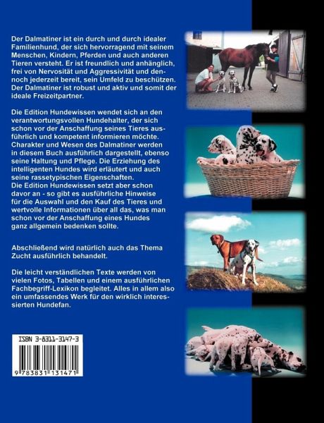 Der Dalmatiner, ein durch und durch idealer Familienhund, der sich hervorragend mit seinem Menschen, Kindern, Pferden und auch anderen Tieren versteht. Er ist freundlich und anhänglich, frei von Nervosität und Aggressivität und dennoch jederzeit bereit, sein Umfeld zu beschützen. Der Dalmatiner ist robust und aktiv und somit der ideale Freizeitpartner. Die Edition Hundewissen wendet sich an den verantwortungsvollen Hundehalter, der sich schon vor der Anschaffung seines Tieres ausführlich und kompetent informieren möchte. Charakter und Wesen des Dalmatiner werden genauso ausführlich dargestellt wie seine Haltung und Pflege. Die Erziehung des intelligenten Hundes wird erläutert und auch seine rassetypischen Eigenschaften.Die Edition Hundewissen setzt aber schon davor an - so gibt es ausführliche Hinweise für die Auswahl und den Kauf des Tieres und wertvolle Informationen über all das, was man schon vor der Anschaffung eines Hundes ganz allgemein bedenken sollte. Abschließend wird natürlich auch das Thema Zucht ausführlich behandelt.Die leicht verständlichen Texte werden von vielen Fotos, Tabellen und zahlreichen Zusatzdokumenten, wie z.B. Gesetzestexten begleitet. Alles in allem also ein umfassendes Werk für den wirklich interessierten Hundfan.