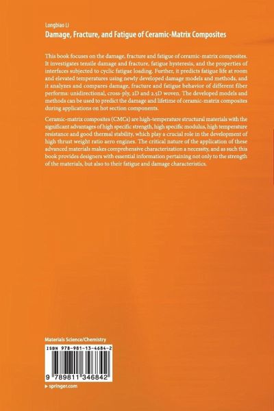 This book focuses on the damage, fracture and fatigue of ceramic-matrix composites. It investigates tensile damage and fracture, fatigue hysteresis, and the properties of interfaces subjected to cyclic fatigue loading. Further, it predicts fatigue life at room and elevated temperatures using newly developed damage models and methods, and it analyzes and compares damage, fracture and fatigue behavior of different fiber performs: unidirectional, cross-ply, 2D and 2.5D woven. The developed models and methods can be used to predict the damage and lifetime of ceramic-matrix composites during applications on hot section components.Ceramic-matrix composites (CMCs) are high-temperature structural materials with the significant advantages of high specific strength, high specific modulus, high temperature resistance and good thermal stability, which play a crucial role in the development of high thrust weight ratio aero engines. The critical nature of the application of these advanced materials makes comprehensive characterization a necessity, and as such this book provides designers with essential information pertaining not only to the strength of the materials, but also to their fatigue and damage characteristics.