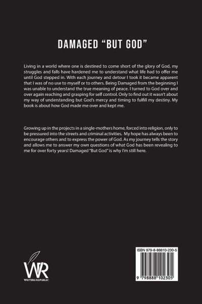 Living in a world where one is destined to come short of the glory of God, my struggles and falls have hardened me to understand what life had to offer me until God stepped in. With each journey and detour I took it became apparent that I was of no use to myself or to others. Being Damaged from the beginning I was unable to understand the true meaning of peace. I turned to God over and over again reaching and grasping for self control. Only to find out it wasn't about my way of understanding but God's mercy and timing to fulfill my destiny. My book is about how God made me over and kept me. Growing up in the projects in a single-mothers home, forced into religion, only to be pressured into the streets and criminal activities. My hope has always been to encourage others and to express the power of God. As my journey tells the story and allows me to answer my own questions of what God has been revealing to me for over forty years! Damaged "But God" is why I'm still here.