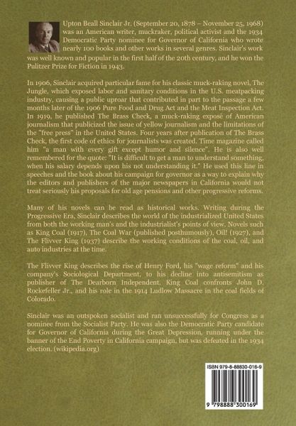 Upton Beall Sinclair Jr. (September 20, 1878 - November 25, 1968) was an American writer, muckraker, political activist and the 1934 Democratic Party nominee for Governor of California who wrote nearly 100 books and other works in several genres. Sinclair's work was well known and popular in the first half of the 20th century, and he won the Pulitzer Prize for Fiction in 1943. In 1906, Sinclair acquired particular fame for his classic muck-raking novel, The Jungle, which exposed labor and sanitary conditions in the U.S. meatpacking industry, causing a public uproar that contributed in part to the passage a few months later of the 1906 Pure Food and Drug Act and the Meat Inspection Act. In 1919, he published The Brass Check, a muck-raking exposé of American journalism that publicized the issue of yellow journalism and the limitations of the "free press" in the United States. Four years after publication of The Brass Check, the first code of ethics for journalists was created. Time magazine called him "a man with every gift except humor and silence". He is also well remembered for the quote: "It is difficult to get a man to understand something, when his salary depends upon his not understanding it." He used this line in speeches and the book about his campaign for governor as a way to explain why the editors and publishers of the major newspapers in California would not treat seriously his proposals for old age pensions and other progressive reforms. Many of his novels can be read as historical works. Writing during the Progressive Era, Sinclair describes the world of the industrialized United States from both the working man's and the industrialist's points of view. Novels such as King Coal (1917), The Coal War (published posthumously), Oil! (1927), and The Flivver King (1937) describe the working conditions of the coal, oil, and auto industries at the time. The Flivver King describes the rise of Henry Ford, his "wage reform" and his company's Sociological Department, to his decline into antisemitism as publisher of The Dearborn Independent. King Coal confronts John D. Rockefeller Jr., and his role in the 1914 Ludlow Massacre in the coal fields of Colorado. Sinclair was an outspoken socialist and ran unsuccessfully for Congress as a nominee from the Socialist Party. He was also the Democratic Party candidate for Governor of California during the Great Depression, running under the banner of the End Poverty in California campaign, but was defeated in the 1934 election. (wikipedia.org)