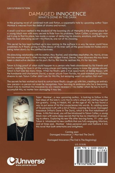 Damaged Innocence What’s Done in the Dark In this gripping novel of combined truth and fiction, a suspenseful tale by upcoming author Tojon Montae is weaved from the debts of drama and turmoil. A small rural town nestled in the shadows of the booming city of Memphis is the perfect place for a young black man with many secrets to hide from his problems. Tatum Collier, a young gay man just trying to find his place, has made a career of deferring his dreams, emotions, and feelings to hide his most disturbing secret—his lifestyle, one not of his choosing. This secret he has kept bottled up is now coming to the surface in a way he never could have predicted. As if finally giving in to the decay of his inner self, all the good inside him fades and is being taken slowly by the justified darkness. His disturbing relationship with his mother, May Rachel, and relentless stepfather, Mr. Harris, drives him into manhood early. After moving in with his best friend, Steven, Tatum discovers this may have been a destructive decision on his part. But by the time he realizes this, it’s far too late. Tatum is living proof of what could happen to a person who feels abandoned by his friends and family. Looking for love in all the wrong places and being too young to know the games played, Tatum is hurt one too many times. When he finally gets a true opportunity at being happy with the handsome and charismatic David, a soccer player from Florida, his past mistakes put all those dreams to rest. Tatum Collier didn’t ask for this life, but escaping wasn’t an option. Not now! The secrets he has worked so hard to outrun have finally caught up with him, creating an entirely new person—a person not even he recognizes. Now learning to embrace who he is becoming, Tatum tries to maintain his innocence by any means necessary—no matter whom he has to hurt to accomplish this, no matter how damaging it may be.