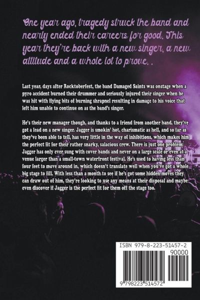 Last year, days after Rocktoberfest, the band Damaged Saints were onstage when a pyro accident burned their drummer and seriously injured their singer when he was hit with flying bits of burning shrapnel resulting in damage to his voice that has left him unable to continue on as the band's singer. He's their new manager though, and thanks to a friend from another band, they've got a lead on a new singer. Jagger is smokin' hot, charismatic as hell, and so far as they've been able to tell, has very little in the way of inhibitions, which makes him the perfect fit for their rather snarky, salacious crew. There is just one problem: Jagger has only ever sung with cover bands and never on a large scale or even at a venue larger than a small-town waterfront festival. He's used to having less than four feet to move around in, which doesn't translate well when you've got a whole big stage to fill. With less than a month to see if he's got some hidden moves they can draw out of him, they're looking to use any means at their disposal and maybe even discover if Jagger is the perfect fit for them off the stage too. Damaged Saints is a book in the multi-author Road to Rocktoberfest 2023 series. Each book can be read as a standalone, but why not read them all and see who hits the stage next? Hot rockstars and the men who love them, what more could you ask for? Kick back and enjoy the men of Rocktoberfest!