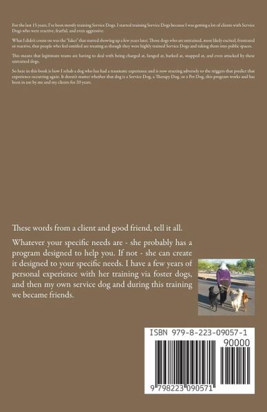 For the last 15 years, I've been mostly training Service Dogs. I started training Service Dogs because I was getting a lot of clients with Service Dogs who were reactive, fearful, and even aggressive. This was mostly before the Medical Alert and Psychiatric Service Dogs were being trained. So most of the dogs I was helping to empower were Guide Dogs, Hearing Dogs and basic Assistance and Mobility Dogs. There were a few trainers like me that started training service dogs at about the same time. But mostly, Service Dogs came from large programs that survived on donations and bred their own dogs. When one of their dogs developed behavior issues for whatever reason, the programs offered to replace the dog. They had either no interest in rehabilitating the dog or possibly didn't know how. Whatever the reason, their clients didn't want to surrender their Service Dog, they just wanted it fixed. Hence the number of people who started coming to me. At that time, I did mostly behavior training and empowerment training. So, I started training service dogs knowing I could do it in such a way that it would be unlikely for each dog to develop behavior issues. What I didn't count on was the "fakes" that started showing up a few years later. Those dogs who are untrained, most likely excited, frustrated or reactive, that people who feel entitled are treating as though they were highly trained Service Dogs and taking them into public spaces. This means that legitimate teams are having to deal with being charged at, lunged at, barked at, snapped at, and even attacked by these untrained dogs. Both the Service Dog and the handler are affected. It can even cause PTSD in one or both when entering public places. In a dog, PTSD often exhibits as reactivity and aggression. This is mostly a means to either scare other dogs away or make them go away. So here in this book is how I rehab a dog who has had a traumatic experience and is now reacting adversely to the triggers that predict that experience occurring again. It doesn't matter whether that dog is a Service Dog, a Therapy Dog, or a Pet Dog, this program works and has been in use by me and my clients for 20 years.