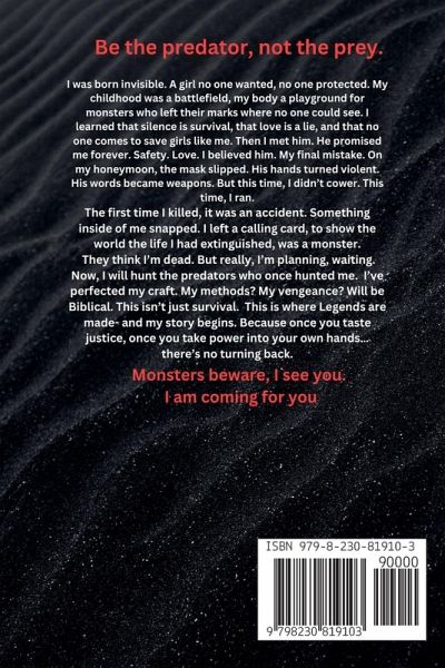 Her past made her a victim, her future will make her a legend. Be the predator, not the prey. I was never supposed to exist. A ghost in my own life, unseen, unloved, unprotected. Just a body to be used. A girl no one saved. I learned at a young age that monsters don't live under the bed. They wear familiar faces. They smile as they destroy you. I kept my mouth shut. I hid the bruises. I played my part. The good daughter. The good girlfriend. The good wife. I was the kind of girl who keeps your secrets while she drowns in her own. But survival? It changes you. It chips away at your humanity, at your innocence. It carves you into something dangerous. There's only so much damage a girl can take before being good stops making sense. Then you just want to burn it all down. They thought they could keep me quiet. That I'd keep taking the punches, the violations. The humiliation's. But I'm not that girl anymore. I buried her in the Atlantic. Now, there's only me, the version they created through every act of cruelty, every betrayal. There's a darkness inside me, born the day I realized no one was coming to save me. It kept me alive. And now... it's hungry. I'm done surviving. I'm ready to make them bleed. And when I do, my vengeance won't just be remembered. It'll be legendary. My names Roxy. This is my story, raw, ugly & unfiltered. Monsters beware, I see you. I am coming for you.