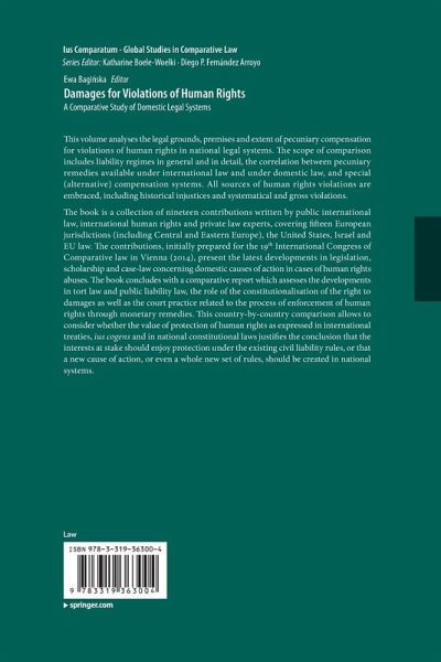 The book is a collection of nineteen contributions written by public international law, international human rights and private law experts, covering fifteen European jurisdictions (including Central and Eastern Europe), the United States, Israel and EU law. The contributions, initially prepared for the 19 th International Congress of Comparative law in Vienna (2014), present the latest developments in legislation, scholarship and case-law concerning domestic causes of action in cases of human rights abuses. The book concludes with a comparative report which assesses the developments in tort law and public liability law, the role of the constitutionalisation of the right to damages as well as the court practice related to the process of enforcement of human rights through monetary remedies. This country-by-country comparison allows to consider whether the value of protection of human rights as expressed in international treaties, ius cogens and in national constitutional laws justifies the conclusion that the interests at stake should enjoy protection under the existing civil liability rules, or that a new cause of action, or even a whole new set of rules, should be created in national systems.