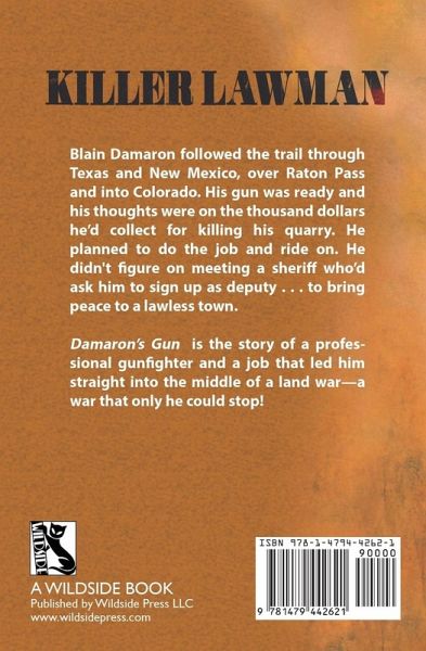 KILLER LAWMAN Blain Damaron followed the trail of Texas and through New Mexico, over Raton Pass into Colorado. his gun was ready and his thoughts were on the thousand dollars he'd collect for killing his quarry. He planned to do the job and ride on. He didn't figure on meeting a sheriff who'd ask him to sign up as deputy... to bring peace to a lawless town. DAMARON'S GUN is the story of a professional gunfighter and a job that led him straight into the middle of a land war–a war that only he could stop.