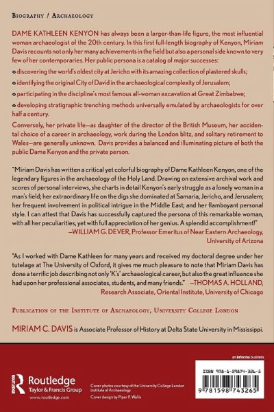 Dame Kathleen Kenyon has always been a larger-than-life figure, likely the most influential woman archaeologist of the 20th century. In the first full-length biography of Kenyon, Miriam Davis recounts not only her many achievements in the field but also her personal side, known to very few of her contemporaries. Her public side is a catalog of major successes: discovering the oldest city at Jericho with its amazing collection of plastered skulls; untangling the archaeological complexities of ancient Jerusalem and identifying the original City of David; participating in the discipline's most famous all-woman excavation at Great Zimbabwe. Her development (with Sir Mortimer Wheeler) of stratigraphic trenching methods has been universally emulated by archaeologists for over half a century. Her private life-her childhood as daughter of the director of the British Museum, her accidental choice of a career in archaeology, her working at bombed sites in London during the blitz, and her solitary retirement to Wales-are generally unknown. Davis provides a balanced and illuminating picture of both the public Dame Kenyon and the private person.