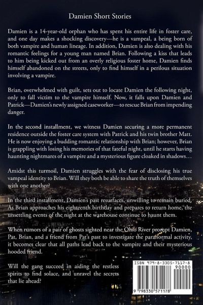 Damien is a 14-year-old orphan who has spent his entire life in foster care, and one day makes a shocking discovery-he is a vampeal, a being born of both vampire and human lineage. In addition, Damien is also dealing with his romantic feelings for a young man named Brian. Following a kiss that leads to him being kicked out from an overly religious foster home, Damien finds himself abandoned on the streets, only to find himself in a perilous situation involving a vampire. Brian, overwhelmed with guilt, sets out to locate Damien the following night, only to fall victim to the vampire himself. Now, it falls upon Damien and Patrick-Damien's newly assigned caseworker-to rescue Brian from impending danger. In the second installment, we witness Damien securing a more permanent residence outside the foster care system with Patrick and his twin brother Matt. He is now enjoying a budding romantic relationship with Brian; however, Brian is grappling with losing his memories of that fateful night, until he starts having haunting nightmares of a vampire and a mysterious figure cloaked in shadows... Amidst this turmoil, Damien struggles with the fear of disclosing his true vampeal identity to Brian. Will they both be able to share the truth of themselves with one another? In the third installment, Damien's past resurfaces, unwilling to remain buried. As Brian approaches his eighteenth birthday and prepares to return home, the unsettling events of the night at the warehouse continue to haunt them. When rumors of a pair of ghosts sighted near the Ohio River prompt Damien, Pat, Brian, and a friend from Pat's past to investigate the paranormal activity, it becomes clear that all paths lead back to the red-haired vampire and their mysterious hooded friend. Will the gang succeed in aiding the restless spirits to find solace, and unravel the secrets that lie ahead?
