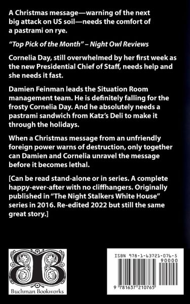 A Christmas message-warning of the next big attack on US soil-needs the comfort of a pastrami on rye. "Top Pick of the Month" - Night Owl Reviews Cornelia Day, still overwhelmed by her first week as the new Presidential Chief of Staff, needs help and she needs it fast. Damien Feinman leads the Situation Room management team. He is definitely falling for the frosty Cornelia Day. And he absolutely needs a pastrami sandwich from Katz's Deli to make it through the holidays. When a Christmas message from an unfriendly foreign power warns of destruction, only together can Damien and Cornelia unravel the message before it becomes lethal. [Can be read stand-alone or in series. A complete happy-ever-after with no cliffhangers. Originally published in "The Night Stalkers White House" series in 2016. Re-edited 2022 but still the same great story.] Buy now and celebrate the Christmas holidays.