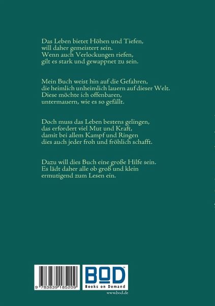 Das Leben ist schön, wertvoll neben anderen Dingen,soll und muss aber trotz Widrigkeiten gelingen.Dazu will dieses Buch eine große Hilfe seinbei vielen Gefahren, Problemen allgemein.Wie man das unersetzliche Leben meistern kann,setzt dieses Buch alles daran und allem voran.Es birgt aktuelle Geschenisse, will das Leben schützen,um seinen Lesern erfolg- und hilfreich zu nützen.Lesen Sie es nachdenkenswert mit Bedacht!Es hat dann sicher Hoffnung ins Leben gebracht!Mit Versen dem Leben auf den Fersen!