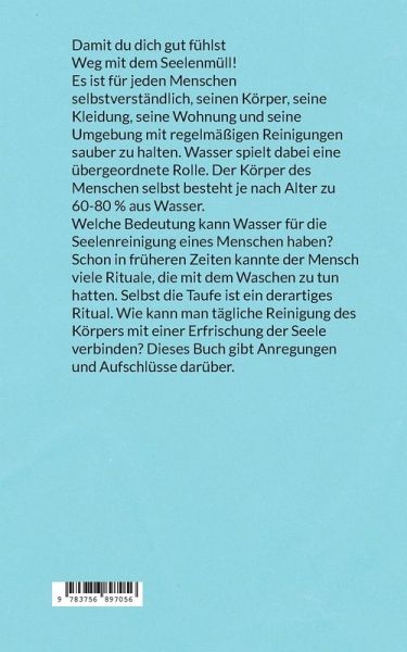 Damit du dich gut fühlstWeg mit dem Seelenmüll!Es ist für jeden Menschen selbstverständlich, seinen Körper, seine Kleidung, seine Wohnung und seine Umgebung mit regelmäßigen Reinigungen sauber zu halten. Wasser spielt dabei eine übergeordnete Rolle. Der Körper des Menschen selbst besteht je nach Alter zu 60-80 % aus Wasser.Welche Bedeutung kann Wasser für die Seelenreinigung eines Menschen haben? Schon in früheren Zeiten kannte der Mensch viele Rituale, die mit dem Waschen zu tun hatten. Selbst die Taufe ist ein derartiges Ritual. Wie kann man tägliche Reinigung des Körpers mit einer Erfrischung der Seele verbinden? Dieses Buch gibt Anregungen und Aufschlüsse darüber.