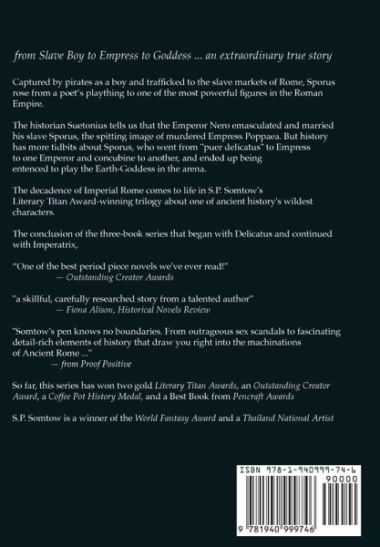 The conclusion of the three-book series that began with Delicatus and continued with Imperatrix. Captured by pirates as a boy and trafficked to the slave markets of Rome, Sporus rose from a poet's plaything to one of the most powerful figures in the Roman Empire. The historian Suetonius tells us that the Emperor Nero emasculated and married his slave Sporus, the spitting image of murdered Empress Poppaea. But history has more tidbits about Sporus, who went from "puer delicatus" to Empress to one Emperor and concubine to another, and ended up being sentenced to play the Earth-Goddess in the arena. The decadence of Imperial Rome comes to life in S.P. Somtow's Literary Titan Award-winning trilogy about one of ancient history's wildest characters. "One of the best period piece novels we've ever read!" - Outstanding Creator Awards "a skillful, carefully researched story from a talented author" - Fiona Alison, Historical Novels Review "Somtow's pen knows no boundaries. From outrageous sex scandals to fascinating detail-rich elements of history that draw you right into the machinations of Ancient Rome ..." - from Proof Positive So far, this series has won two gold Literary Titan Awards, an Outstanding Creator Award, a Coffee Pot History Medal, and a Best Book from Pencraft Awards S.P. Somtow is a winner of the World Fantasy Award and a Thailand National Artist