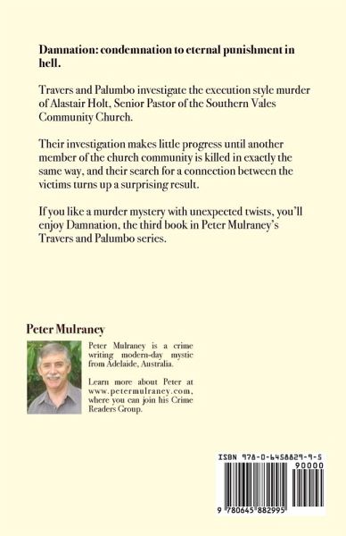 Damnation: condemnation to eternal punishment in hell.Travers and Palumbo investigate the execution style murder of Alastair Holt, Senior Pastor of the Southern Vales Community Church. Their investigation makes little progress until another member of the church community is killed in exactly the same way, and their search for a connection between the victims turns up a surprising result.If you like a murder mystery with unexpected twists, you'll enjoy Damnation, the third book in Peter Mulraney's Travers and Palumbo series.