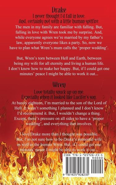 The devil will walk the earth. To plan a wedding. Drake I never thought I’d fall in love. And certainly not with a little human spitfire. The men in my family are familiar with falling. But falling in love with Wren took me by surprise. And, while everyone agrees we’re married by my father’s law, apparently everyone likes a party. So, now we have to plan what Wren’s mum calls the ‘proper wedding’. But Wren’s torn between Hell and Earth, between being my wife for all eternity and living a human life. I don’t know how to make her happy. But if I could get one minutes’ peace, I might be able to work it out. Wren Love totally snuck up on me Especially when it looked like Lucifer’s son. At barely eighteen, I’m married to the son of the Lord of Hell. It wasn’t something I planned and I don’t know I’d recommend it. But I wouldn’t change a thing. Except, there’s pressure on all sides o have a ‘proper wedding’, and everything that involves. I love Drake more than I thought was possible. But I’m not sure how to be Drake’s immortal wife as well as the human Wren. But If I could get one minutes’ peace, I might be able to work it out.