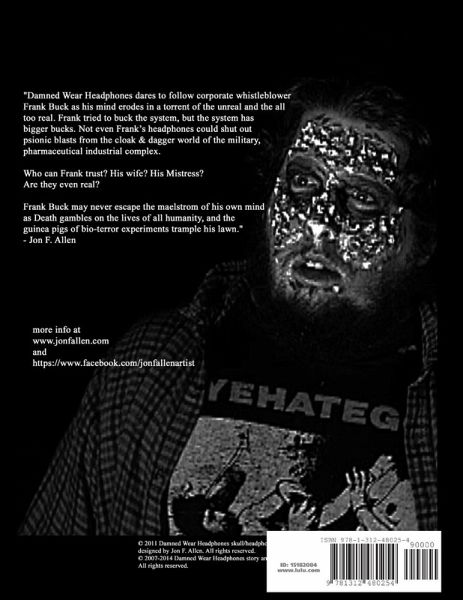 "Damned Wear Headphones dares to follow corporate whistleblower Frank Buck as his mind erodes in a torrent of the unreal and the all too real. Frank tried to buck the system, but the system has bigger bucks. Not even Frank's headphones could shut out psionic blasts from the cloak & dagger world of the military, pharmaceutical industrial complex. Who can Frank trust? His wife? His Mistress? Are they even real? Frank Buck may never escape the maelstrom of his own mind as Death gambles on the lives of all humanity, and the guinea pigs of bio-terror experiments trample his lawn." - J.F.A.